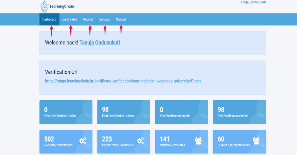 - At the top of the page, we can able to view all the modules like Dashboard, Certificates, Reports, Settings, and Signout. On clicking on the modules, we can access all the tabs in that modules.