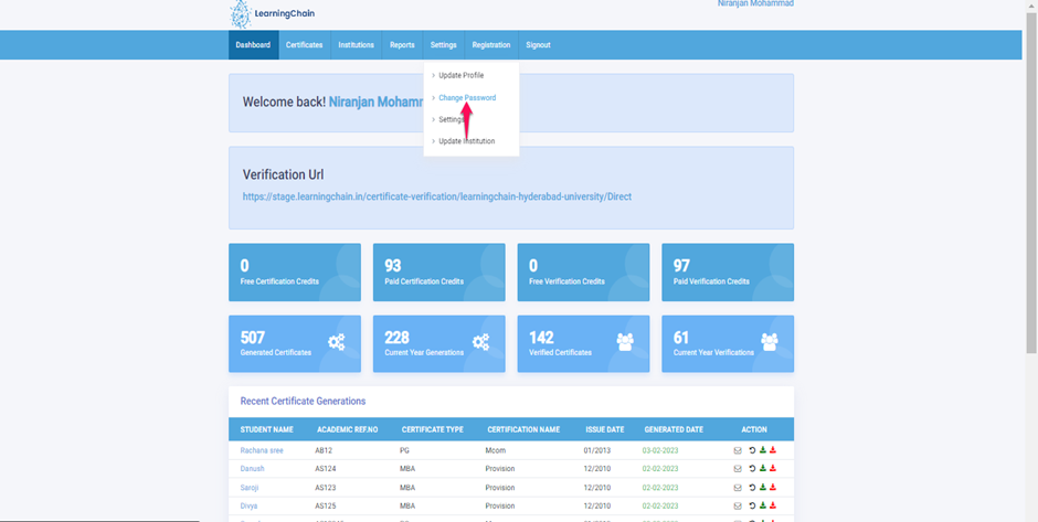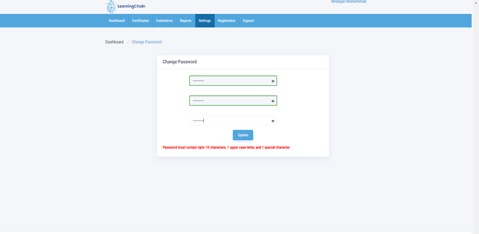 - To Edit/Change my password, Click on Settings Module and then click on Change Password.